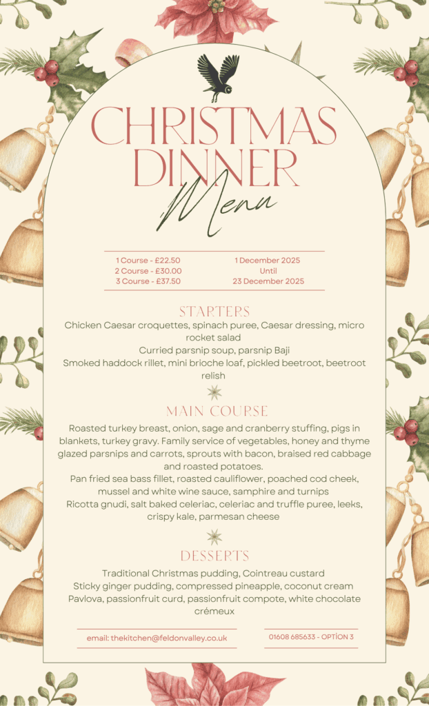To book email thekitchen@feldonvalley.co.uk or call 01608 685633 – Option 3.